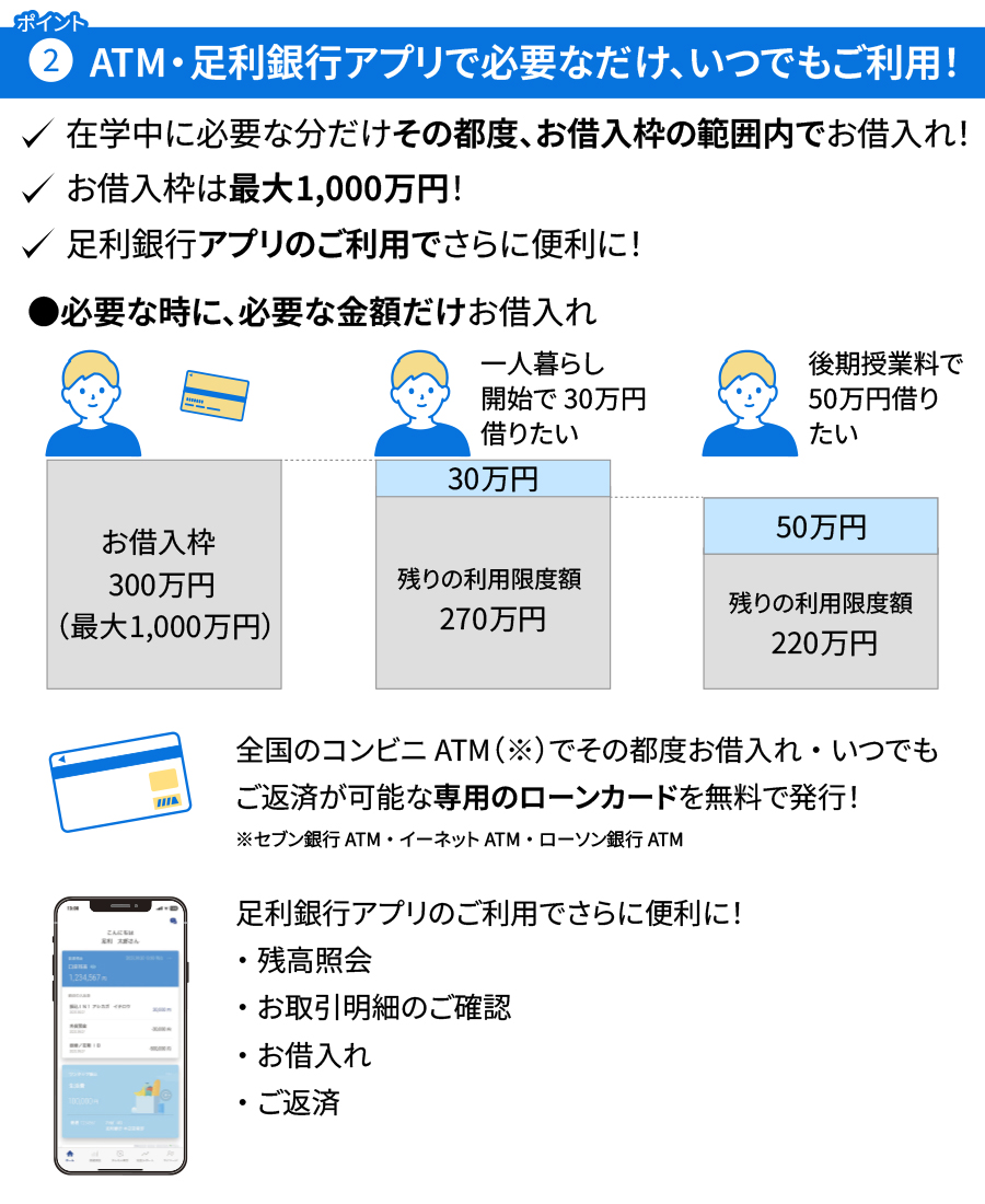 資金が必要になった際は足利銀行アプリまたはATMからお借入れいただけます。