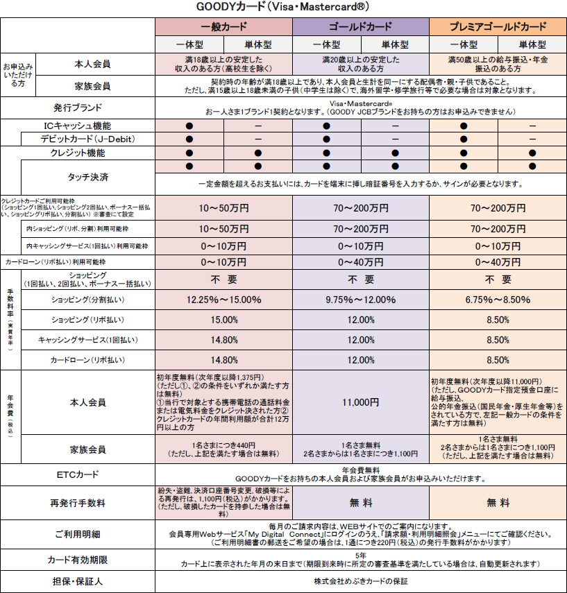 | ご利用可能枠とお支払方法 | QUICPayでのご利用分は、GOODYカードのショッピングご利用分と合算され、本人カードのご利用可能枠でご利用いただけます。また、お支払方法は本人カードに準じた設定となります。 |